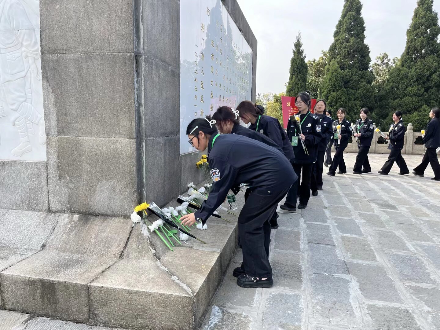 在庄严的烈士纪念碑前,全体人员重温入党誓词,铿锵有力的誓言回荡在陵园上空,彰显了保卫队伍坚定的理想信念与责任担当。仪式结束后,全体成员在纪念碑前合影留念,定格庄重时刻。